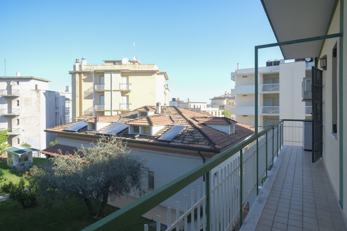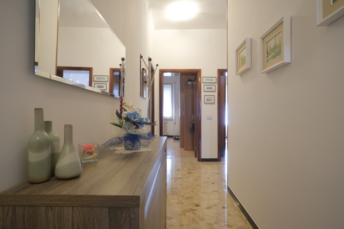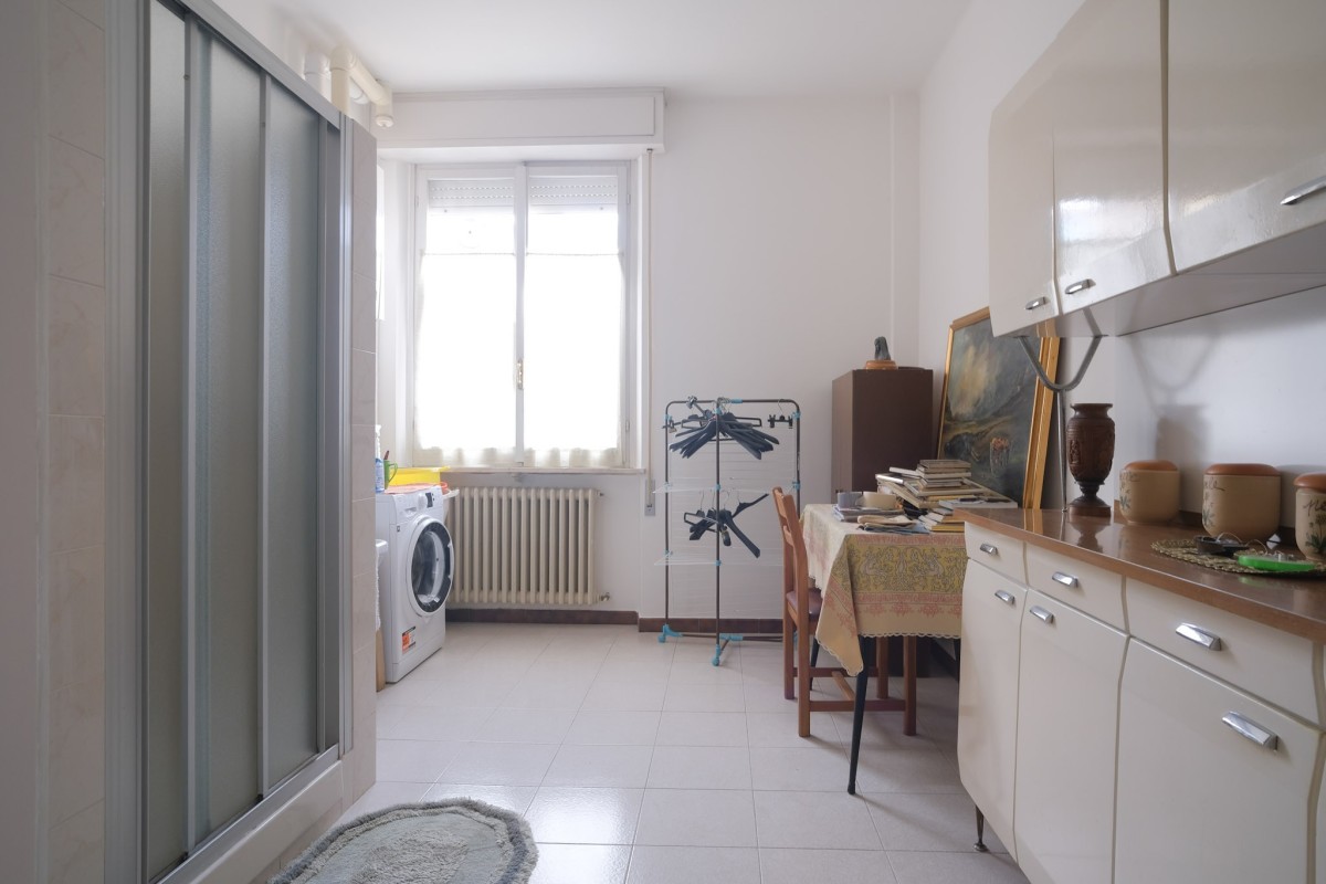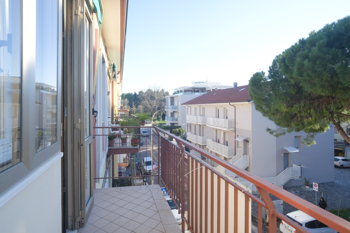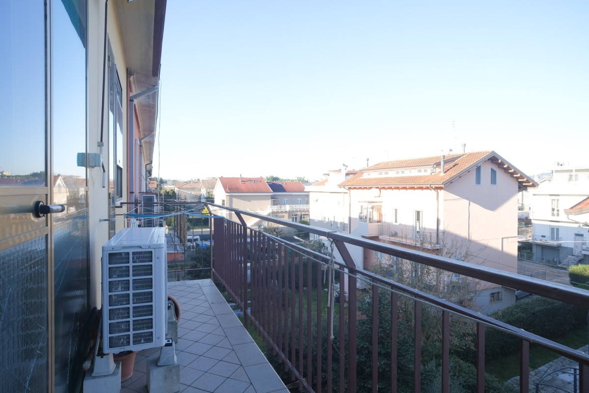 L'appartamento, sito al quinto ed ultimo piano servito da ascensore, è internamente composto da accogliente ingresso con zona giorno suddivisa in luminoso salotto dotato di balcone, da cui poter ammirare dall'alto la città di Pesaro, e soggiorno separato con ulteriore balcone e cucina. Proseguendo tramite il comodo disimpegno, troviamo 2 camere da letto matrimoniali, un ripostiglio, il bagno finestrato, e per finire un’ampia stanza attualmente dedicata alla lavanderia, perfetta per essere utilizzata come terza camera da letto.