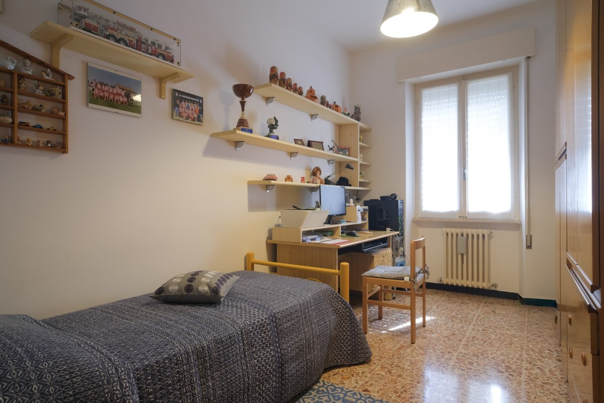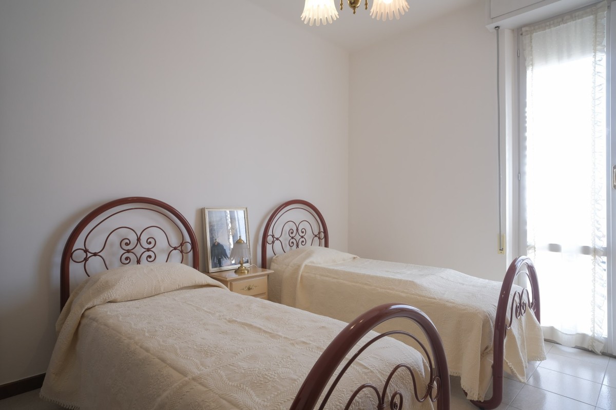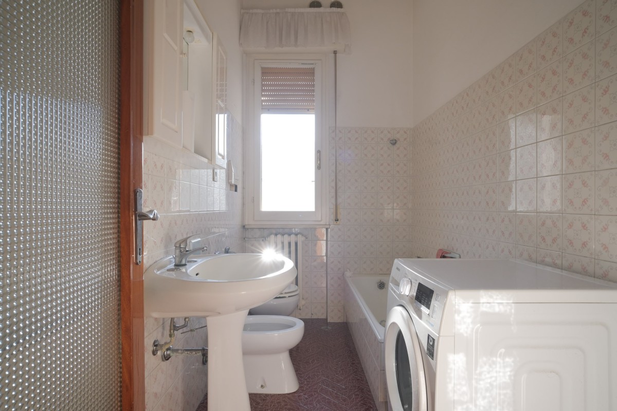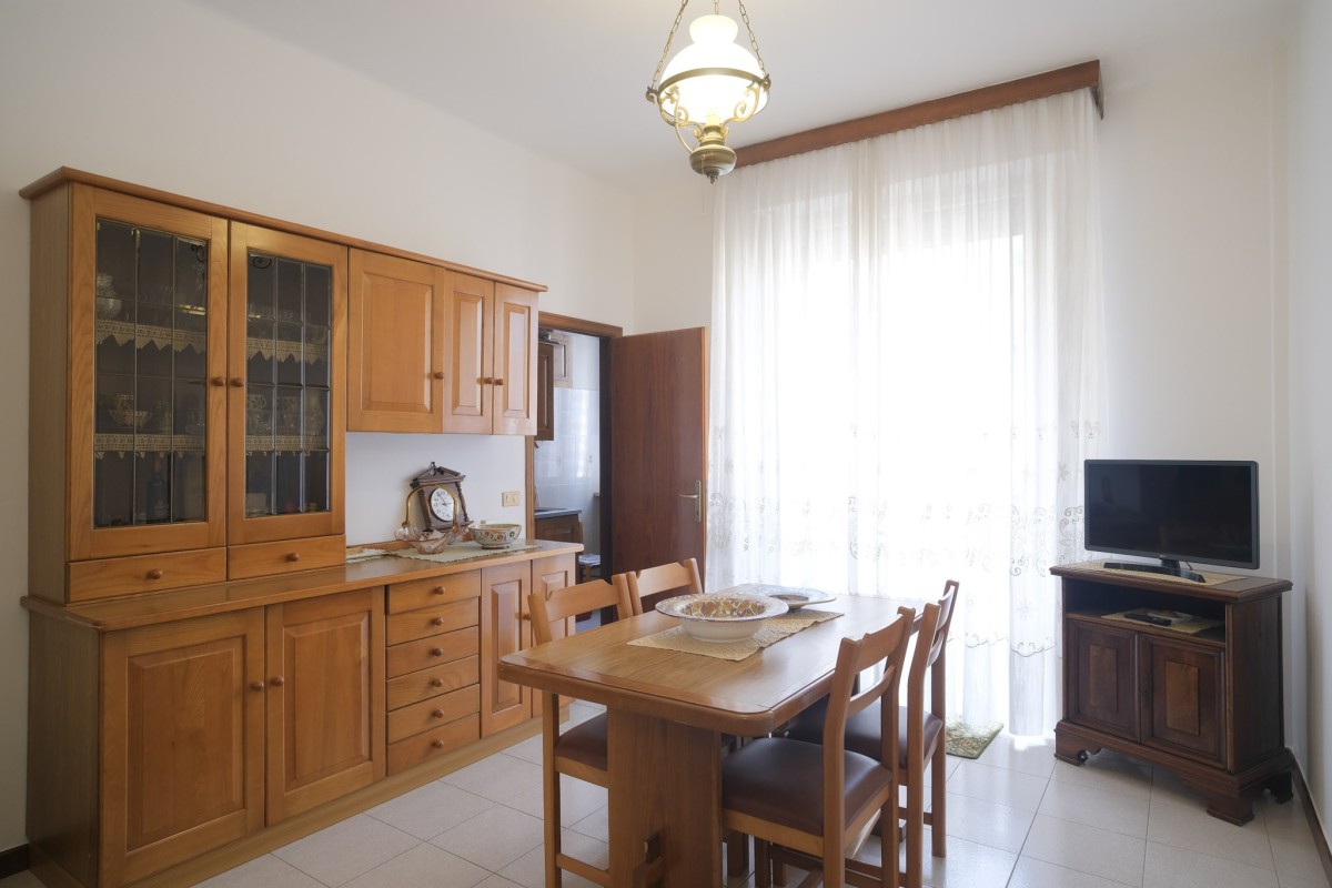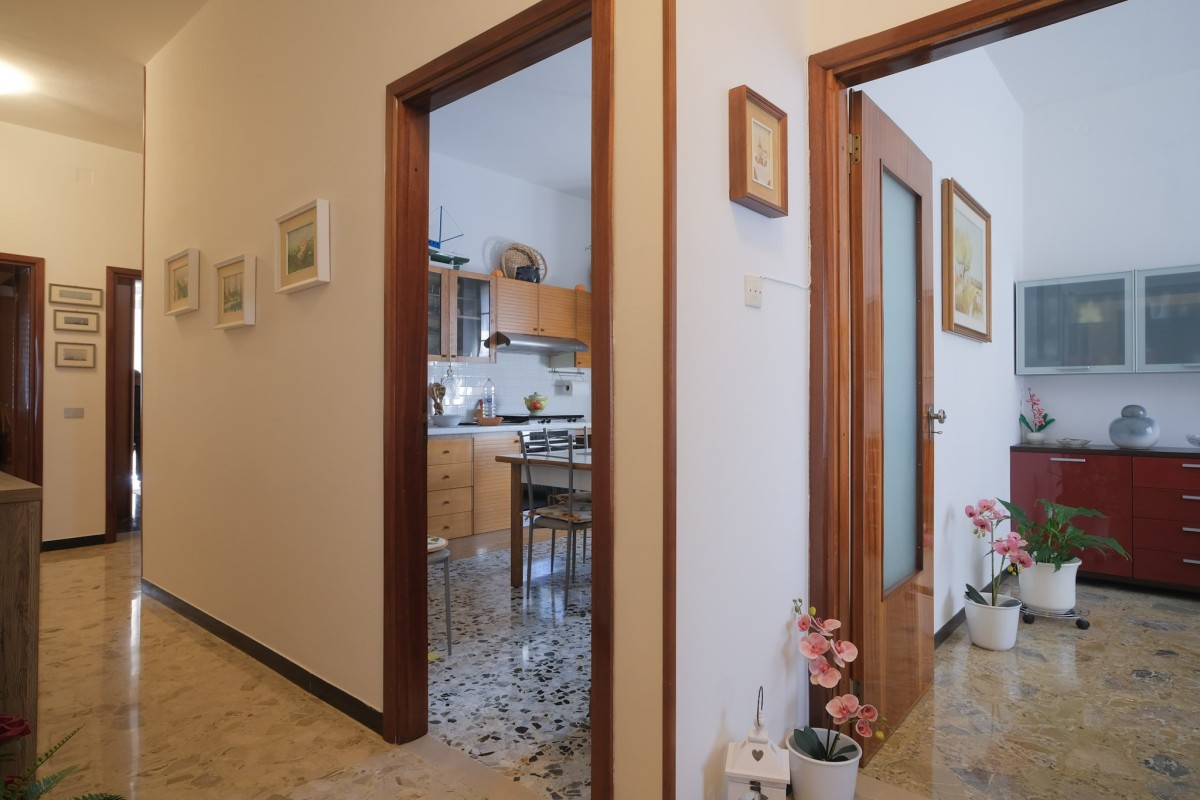 L'appartamento, sito al quinto ed ultimo piano servito da ascensore, è internamente composto da accogliente ingresso con zona giorno suddivisa in luminoso salotto dotato di balcone, da cui poter ammirare dall'alto la città di Pesaro, e soggiorno separato con ulteriore balcone e cucina. Proseguendo tramite il comodo disimpegno, troviamo 2 camere da letto matrimoniali, un ripostiglio, il bagno finestrato, e per finire un’ampia stanza attualmente dedicata alla lavanderia, perfetta per essere utilizzata come terza camera da letto.