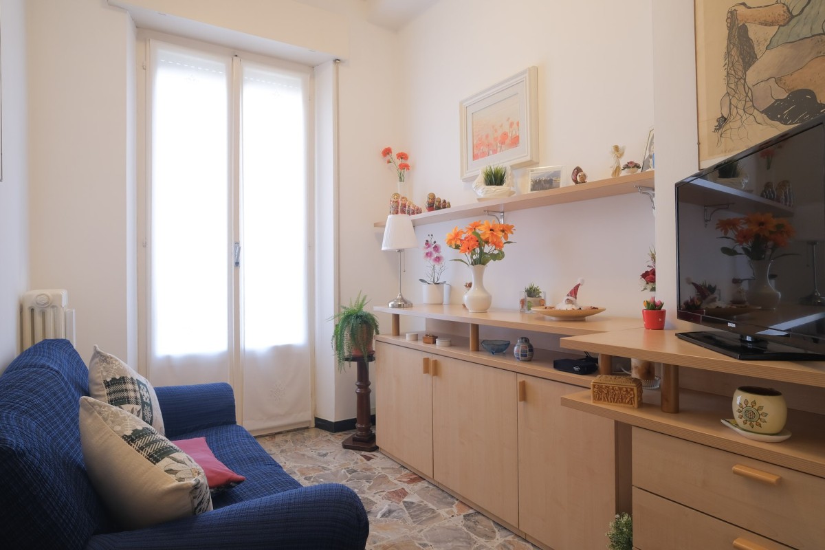 soggiorno con cucina abitabile separata, disimpegno, 1 camera matrimoniale e 1 camera singola, bagno finestrato e due balconi.