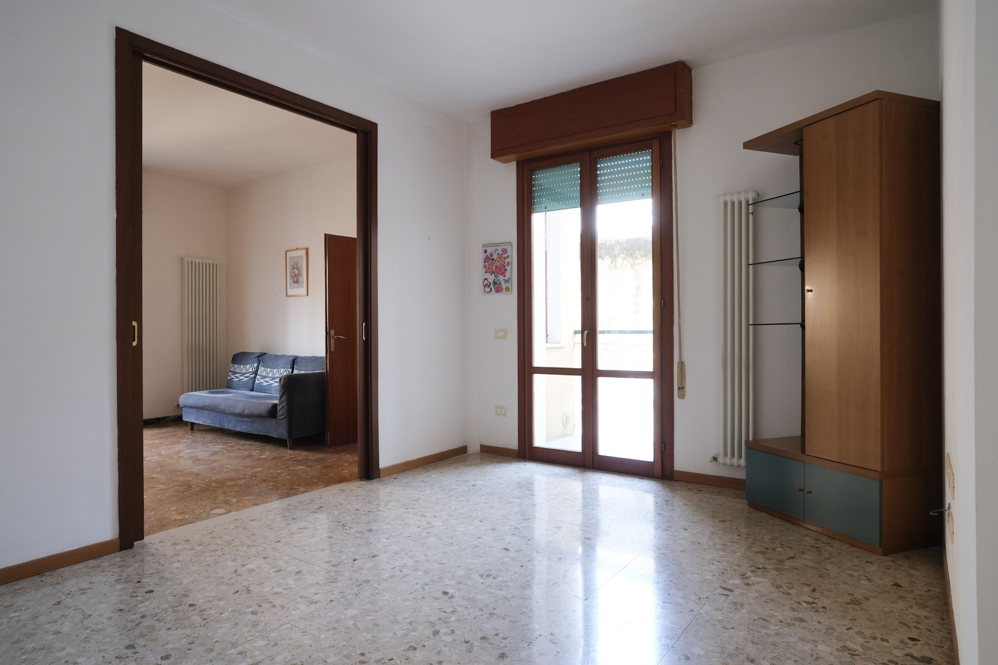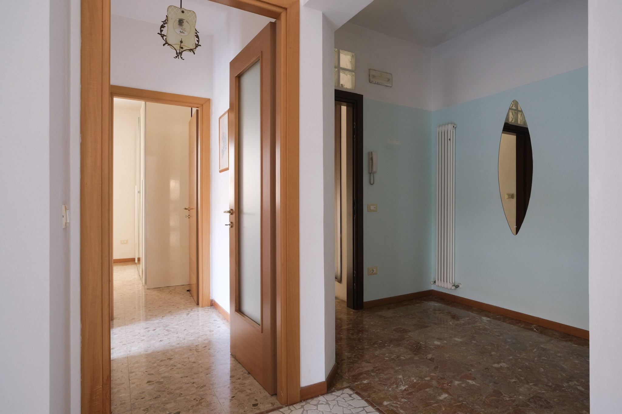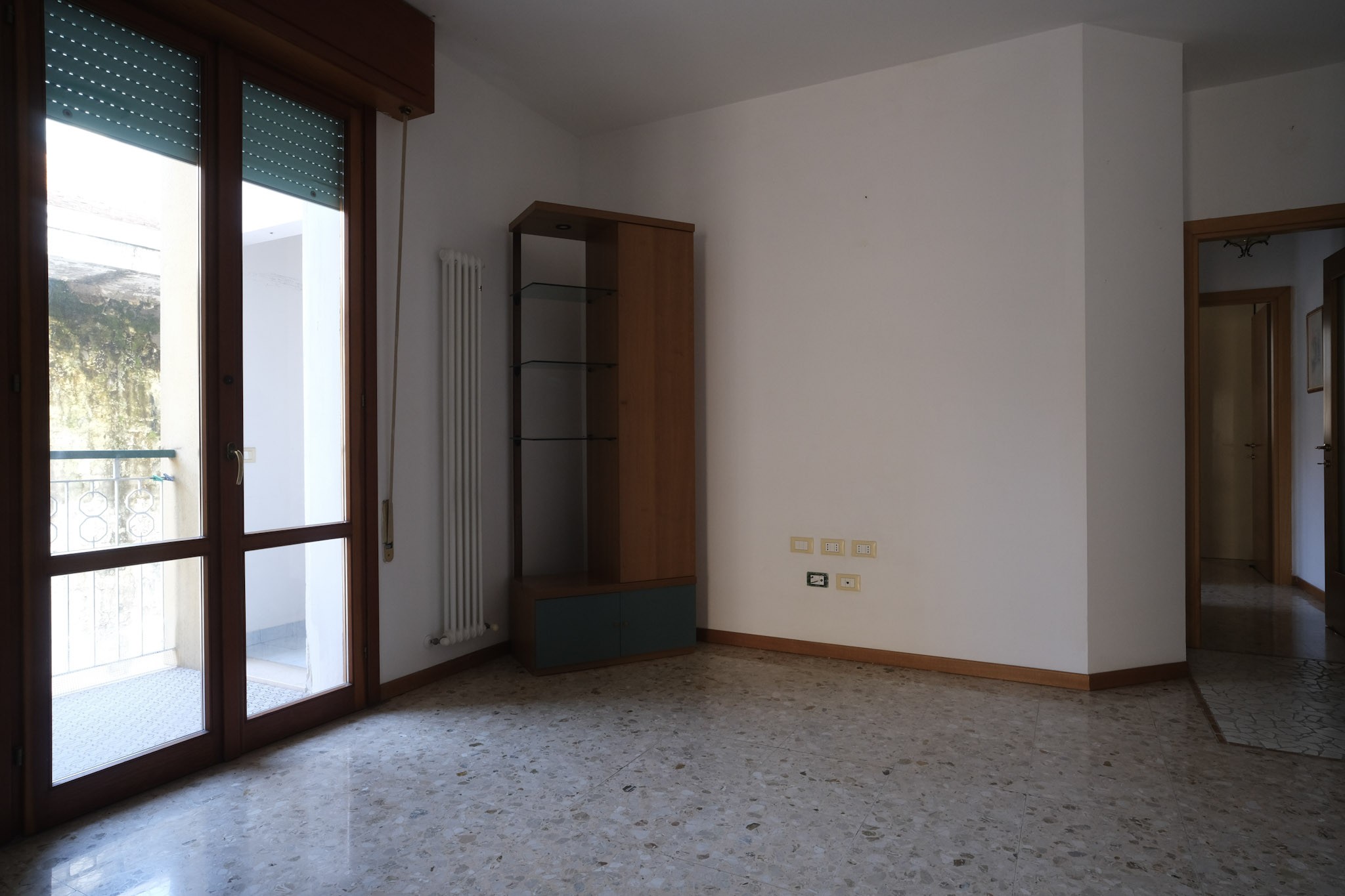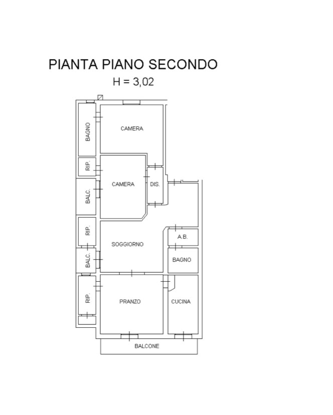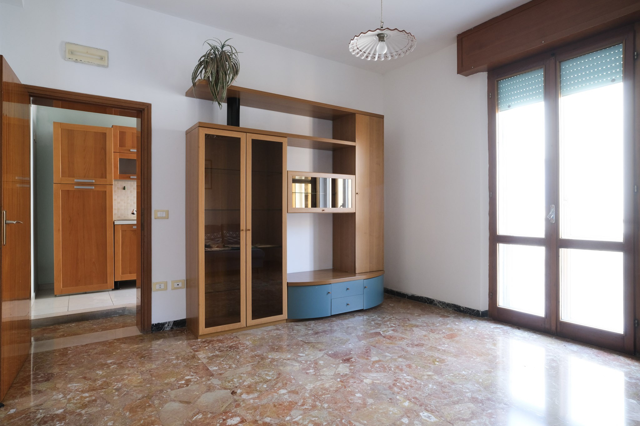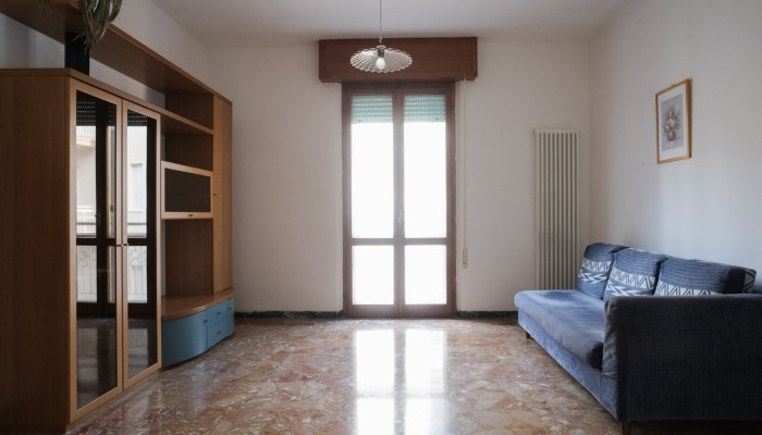 L'abitazione internamente è composta da ingresso che conduce al soggiorno dotato di balcone, e successivamente alla zona pranzo, servita da cucina separata, ripostiglio con finestra e ulteriore balcone.