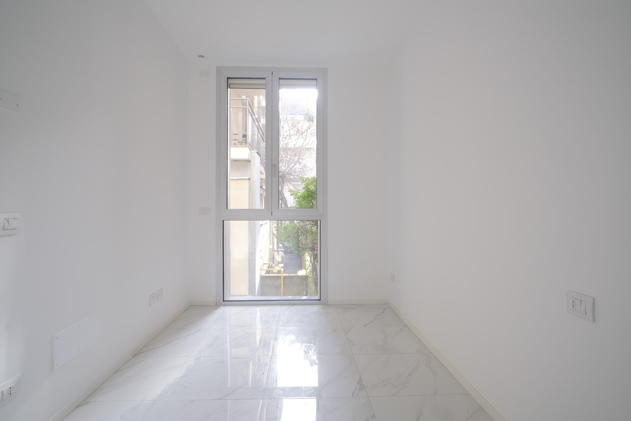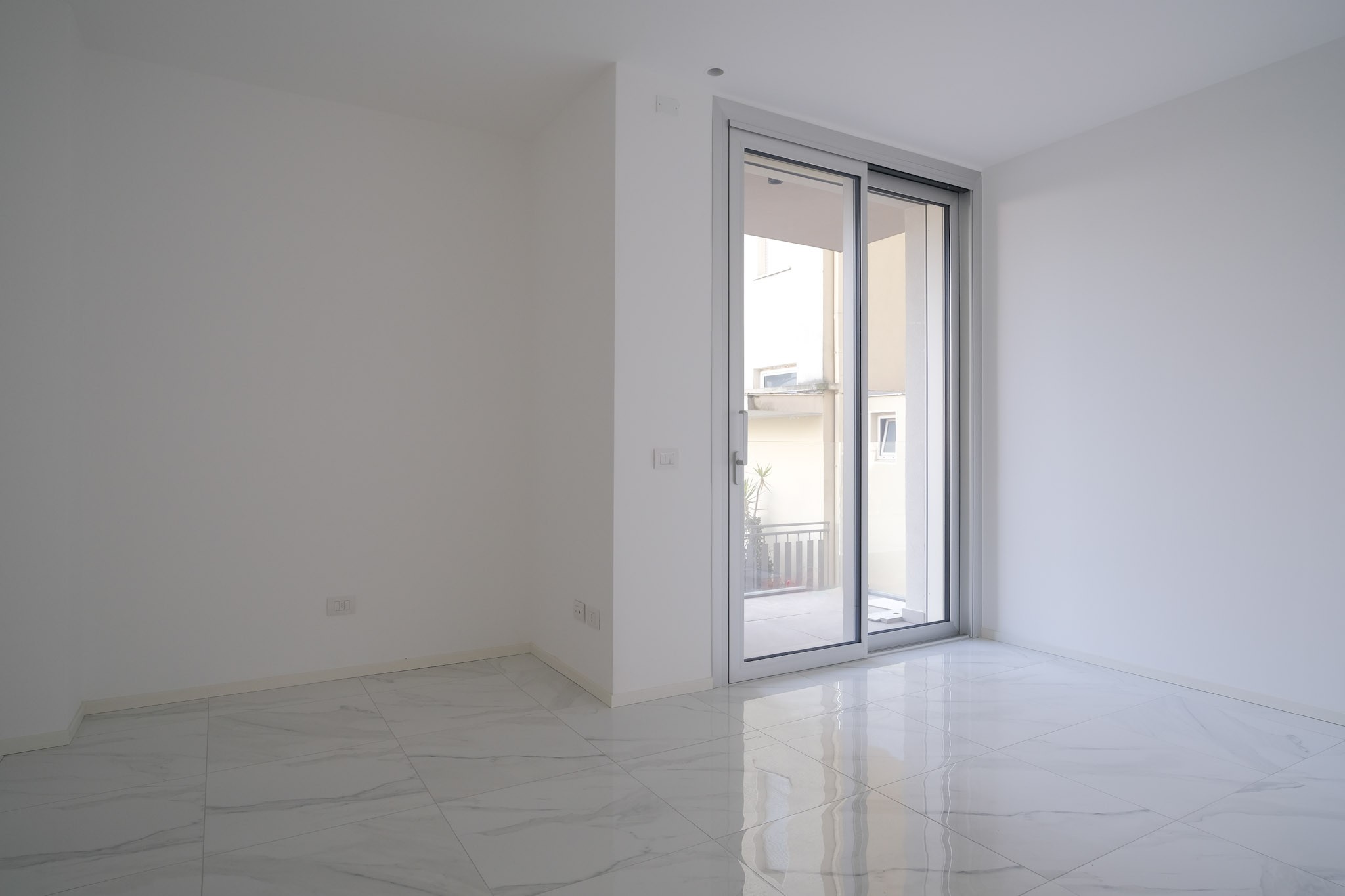 L'appartamento, sito al piano terra, è internamente composto da ingresso su luminoso soggiorno con balcone e predisposizione per angolo cottura. Proseguendo troviamo il disimpegno con la camera matrimoniale dotata di balcone, camera singola e bagno finestrato con box doccia ed attacco per lavatrice.