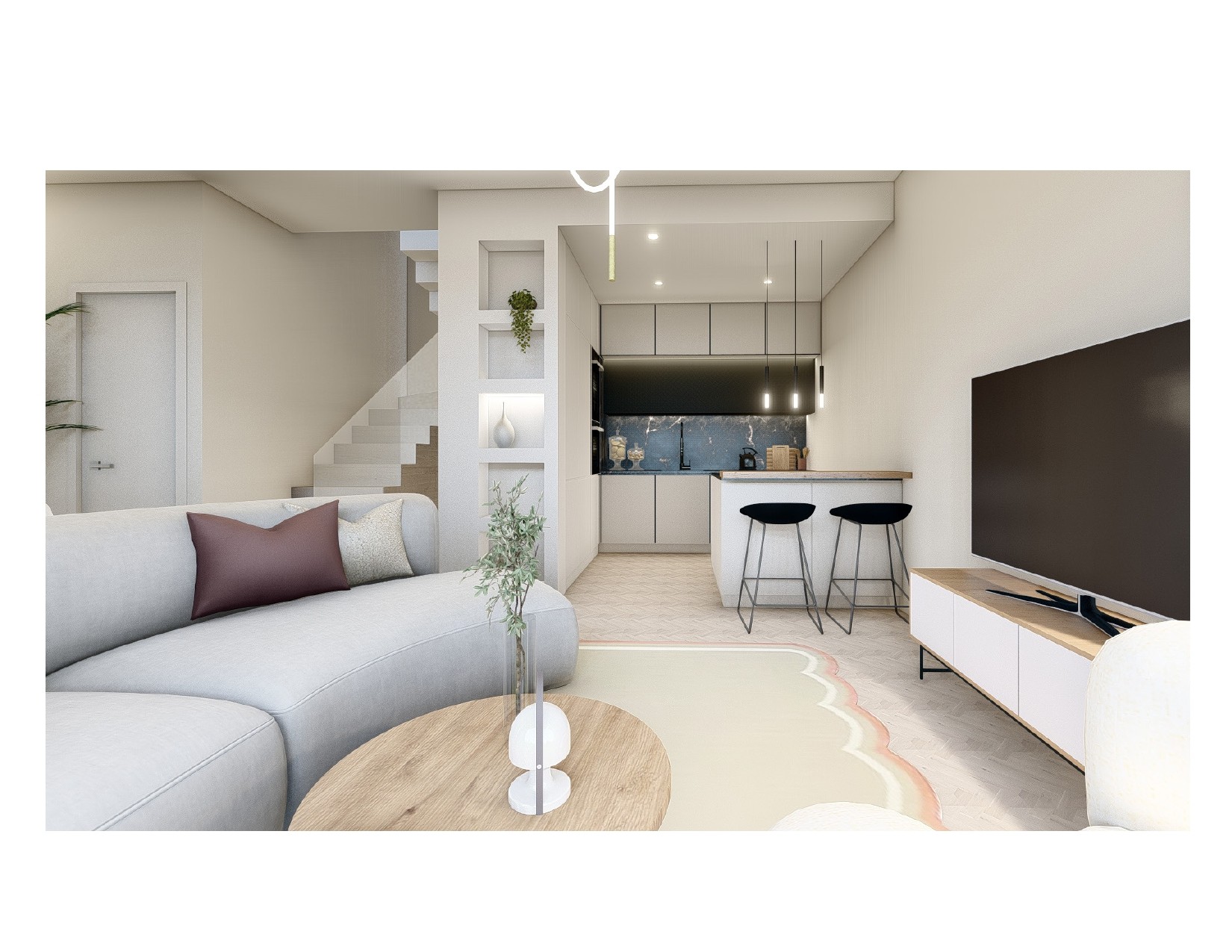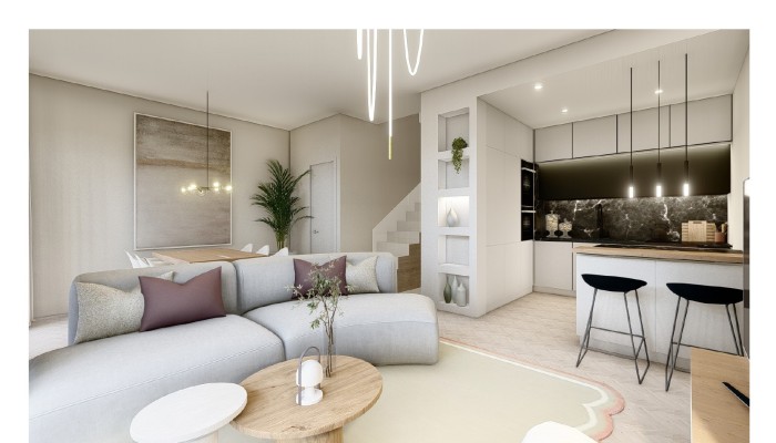 L'edificio, comprendente un totale di n° 6 villette a schiera, sarà coibentato termicamente e completo di pannelli fotovoltaici; inoltre le abitazioni saranno dotate di impianti autonomi, riscaldamento a pavimento con caldaia elettrica a pompa di calore, infissi in PVC e portone d'ingresso blindato.