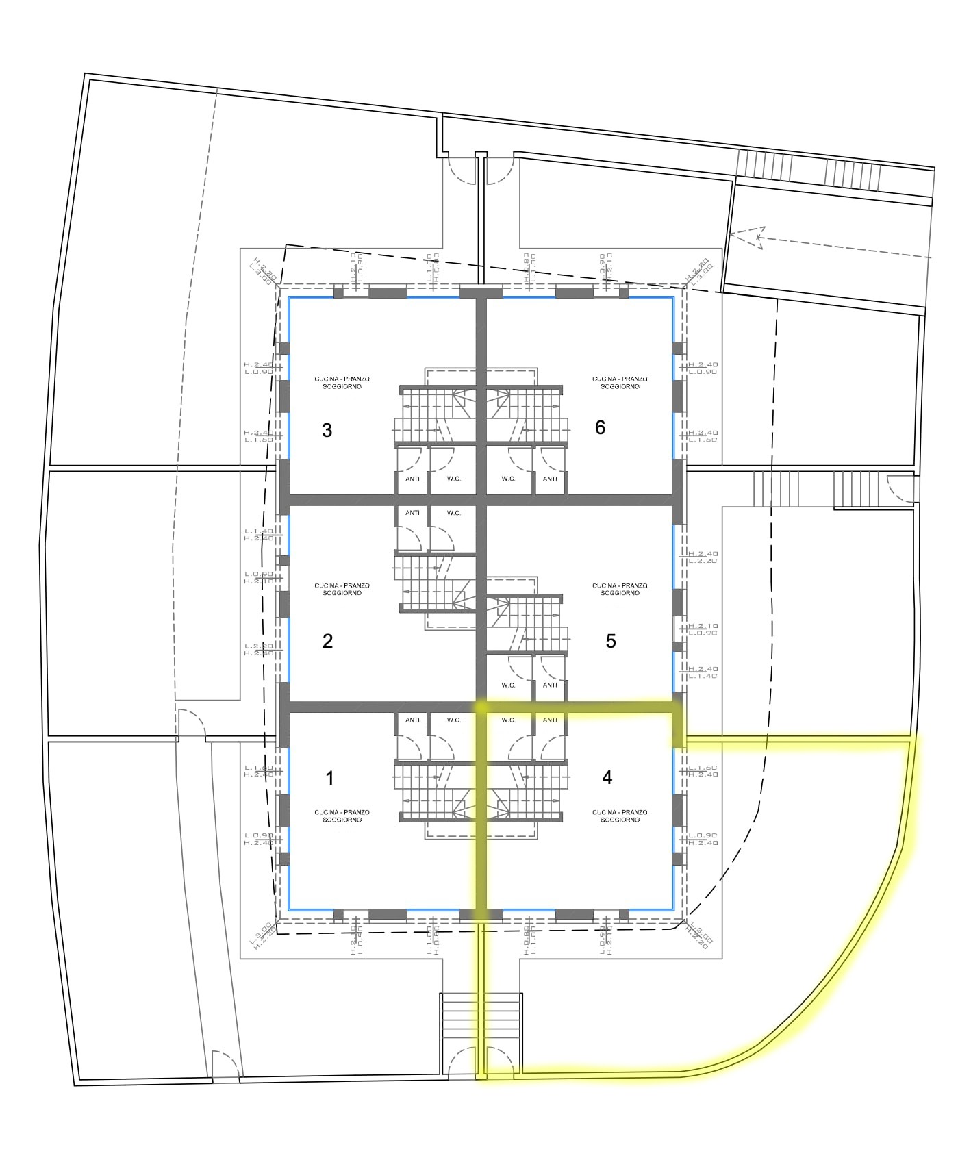 Piano terra dedicato interamente alla zona giorno, con antibagno e bagno, e servito da piacevole giardino ad uso esclusivo di 96 Mq.