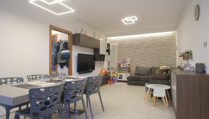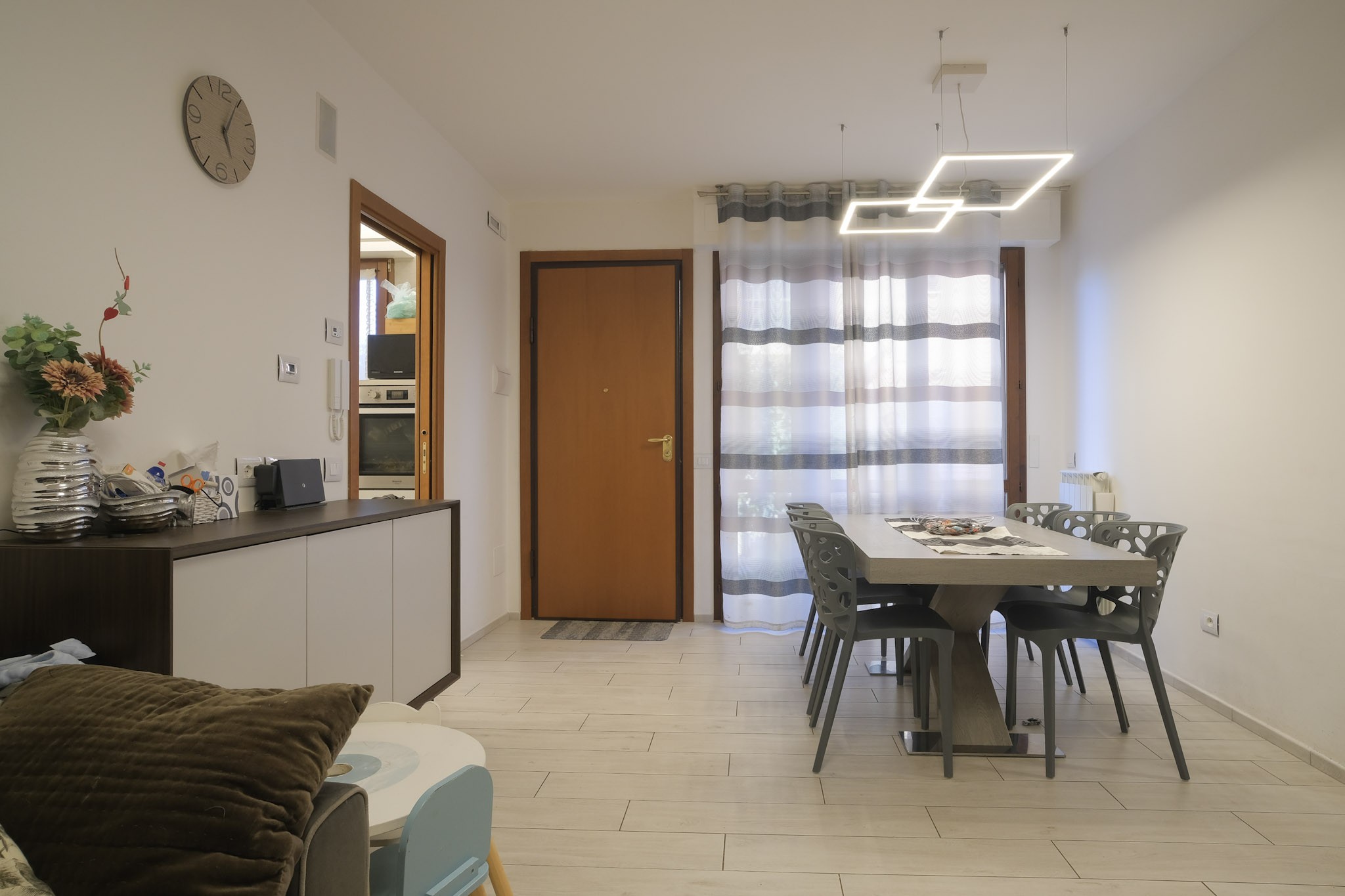 L’appartamento, sito al piano terra, è internamente composto da soggiorno, cucina abitabile separata, disimpegno, camera matrimoniale, camera singola e bagno finestrato.